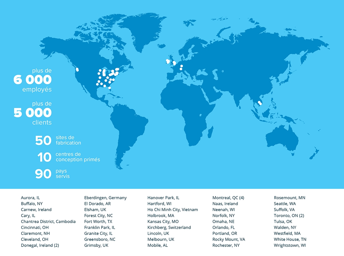 Grace à une croissance stratégique, notre réseau a pris une envergure internationale. Nous comptons plus de 5 800 employés collaboratifs et motivés à travers 48 centres de fabrication par excellence répartis sur trois continents et sept pays (y compris les États-Unis, le Royaume-Uni, le Canada, l’Allemagne, la Suisse et le Sud-Est asiatique) qui sont soutenus par six centres primés de conception graphique au service de plus de 5 000 clients sur 90 pays. Ensemble nous desservons divers marchés tout en mettant en évidence nos valeurs fondamentales et notre prédilection pour l’innovation, le service exceptionnel et la production d’emballages flexibles de très grande qualité.